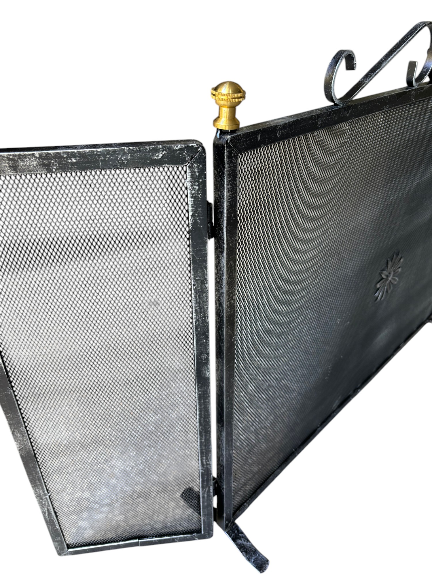 PARASCINTILLE PER CAMINO CAMINETTO 3 ANTE IN FERRO BATTUTO CON POMELLI IN OTTONE
